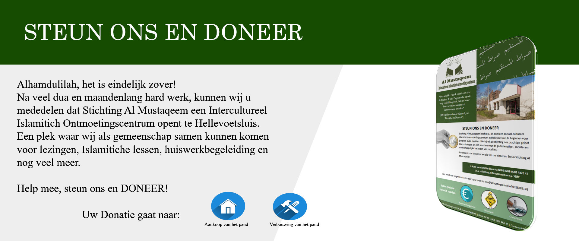 Stichting Al Mustaqeem heeft o.a. als doel om een sociaal-cultureel islamitisch ontmoetingscentrum in Hellevoetsluis te beginnen voor de in Nederland wonende moslims van alle leeftijden. Hierbij wil de stichting ons prachtige geloof Islam uitdragen en zich inzetten voor de godsdienstige-, sociale- en maatschappelijke ontwikkeling en belangen van moslims. Verder wil de stichting zicht inzetten om de saamhorigheid tussen enerzijds de moslims onderling en anderzijds tussen de moslims en de omgeving waartoe zij behoren te bevorderen
